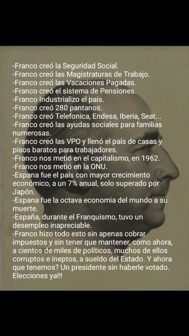 ¿FALSO? Dame documentos que lo desmientan, yo particularmente no viví la época de Franco, pero sí mis padres, ellos han vivido las dos épocas y saben todo lo que hizo el Caudillo, así que una vez más, demuéstrame que lo que se dice es falso.